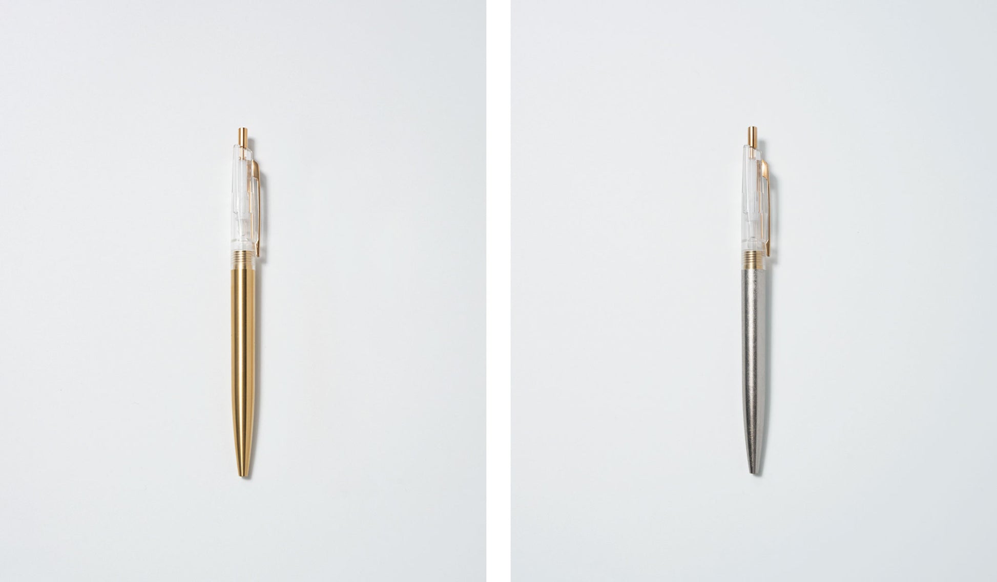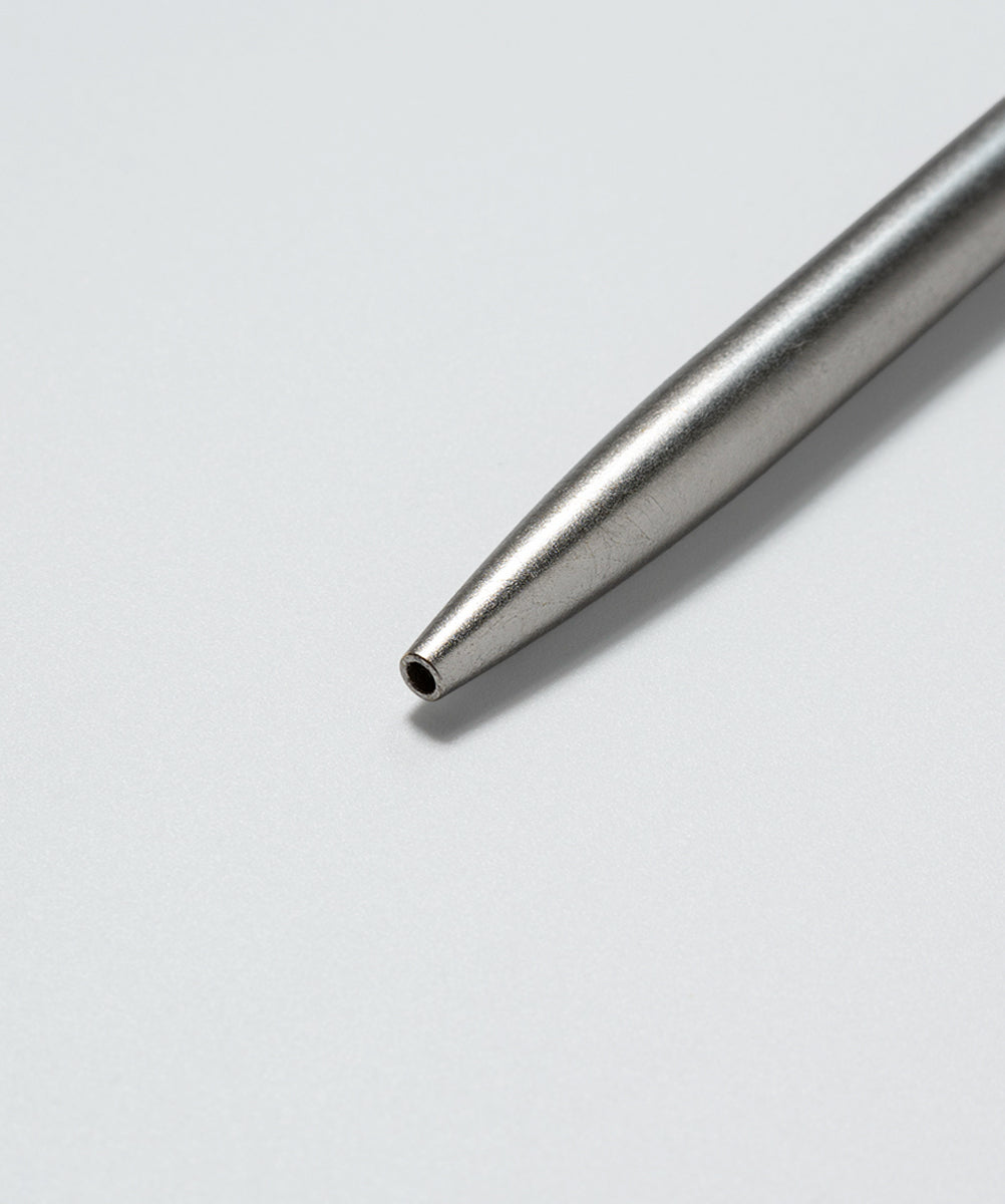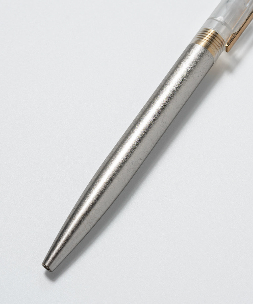 その実用本位の佇まいに、京都で受け継がれてきた箔押し(プラチナ箔)の技法を重ねました。強い輝きで主張するのではなく、光をやわらかく受け止め、輪郭や形を静かに際立たせる「面」としての箔。書くという行為そのものに、過度な装飾ではない、静かな緊張感と奥行きを添えています。日常の道具であるからこそ、手に取るたびに、素材と技の存在をさりげなく感じられる一本を目指しています。